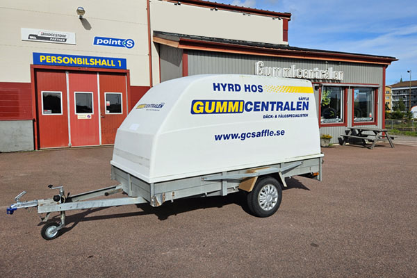 Vårt mindre täckta släp. Rymmer 6.64 kubik.