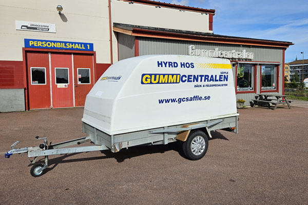 Vårt mindre täckta släp. Rymmer 6.64 kubik.